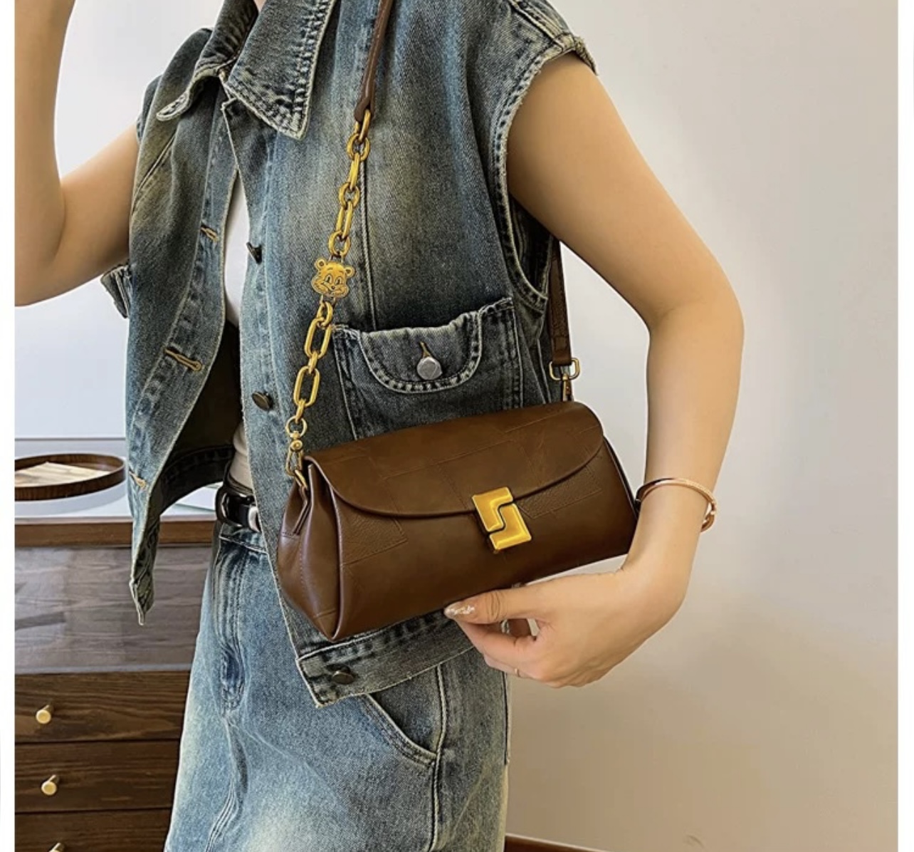 دارای دو بند بلند و کوتاه-بند کوتاه ترکیب چرم و زنجیر-حک برند-داخل کار دارای زیپ-آسترکشی شده